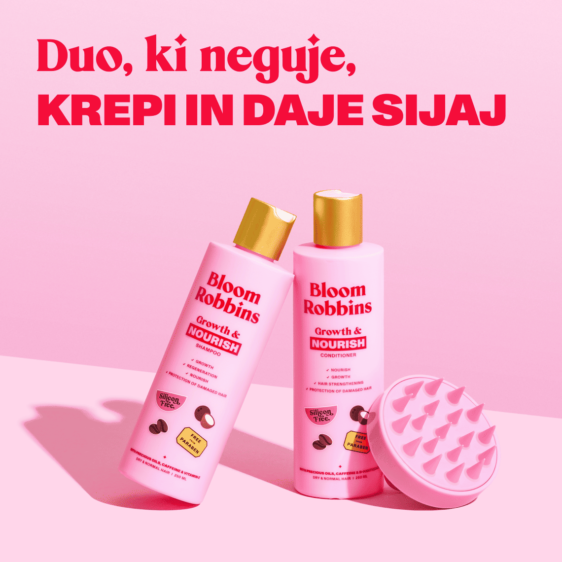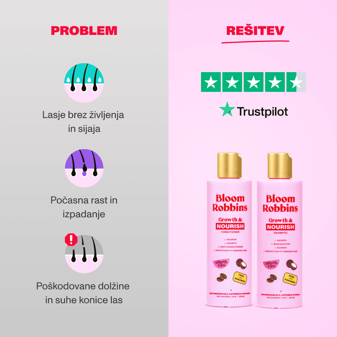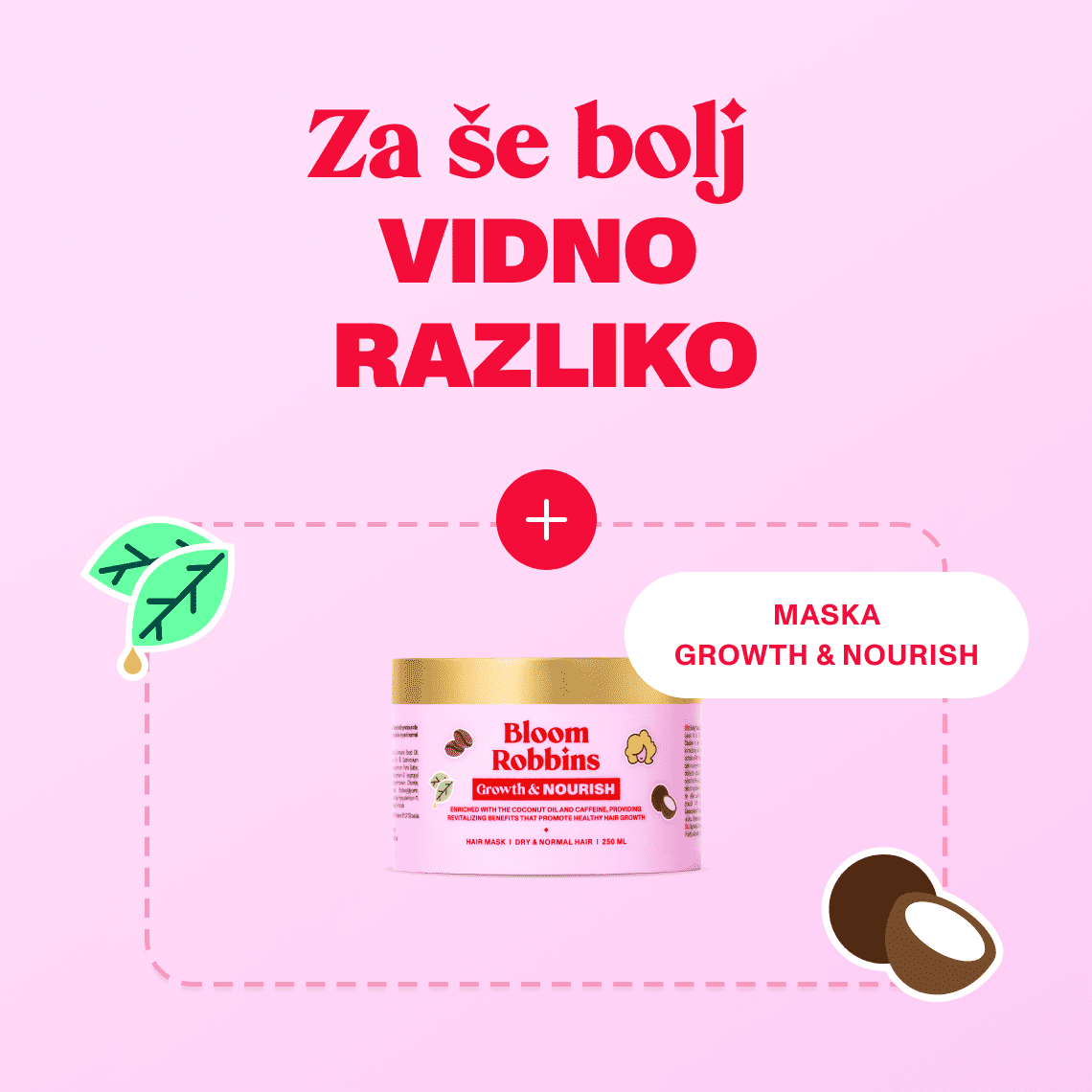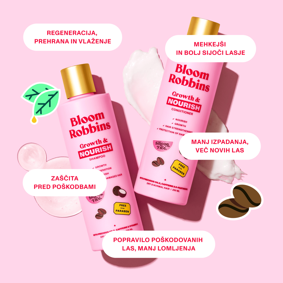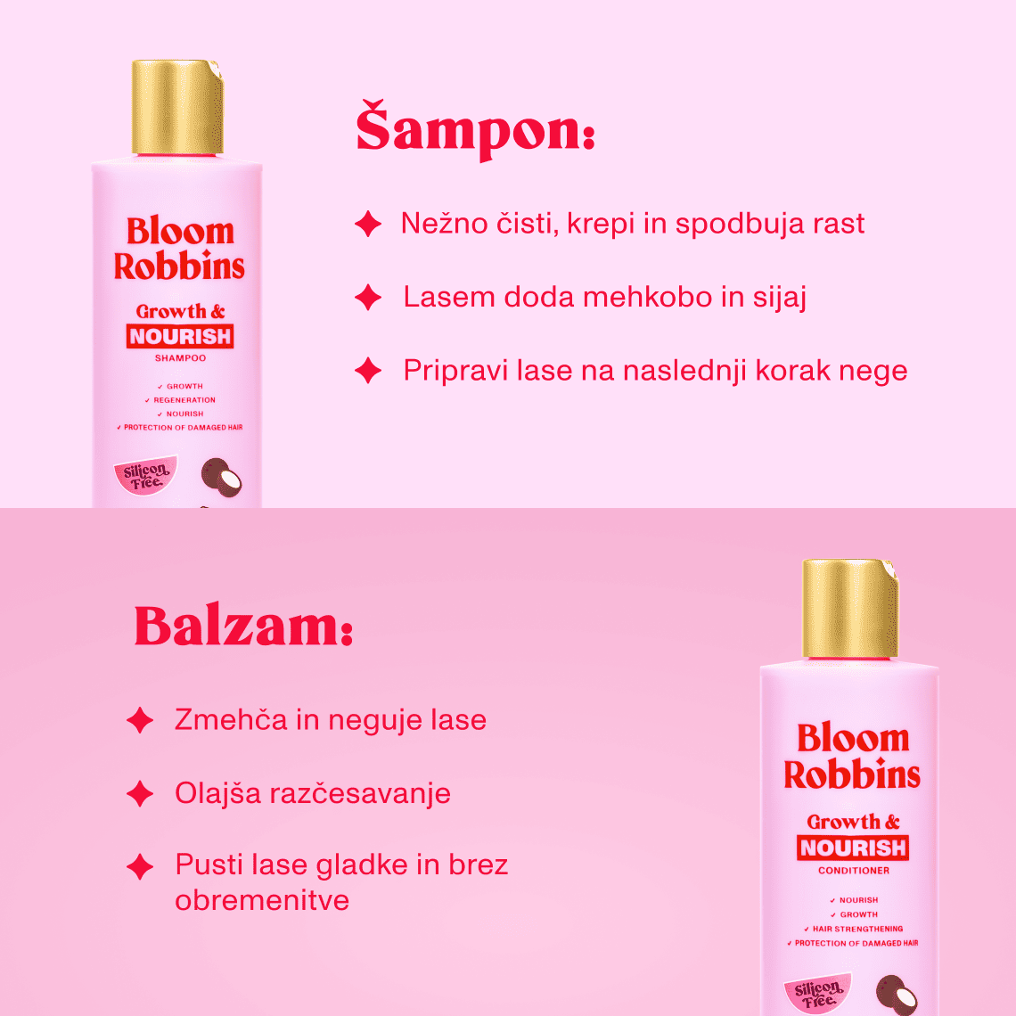 Če imaš normalne ali suhe lase, si pravkar našla svojo najljubšo kombinacijo za lase! Šampon in balzam Growth&Nourish globinsko regenerirata, vlažita in naredita lase gladke in sijoče. Kombinacija najboljših sestavin na trgu, kot so D-pantenol, karitejevo maslo ali arganovo in kokosovo olje, bo uresničila tvoje sanje o lepih in zdravih laseh. Kofein pa spodbuja rast las in preprečuje njihovo izpadanje. Tvoji lasje bodo neprepoznavni! Sladka pika na i- popoln vonj po kokosu, ki bo lepo odišavil tvojo kopalnico.