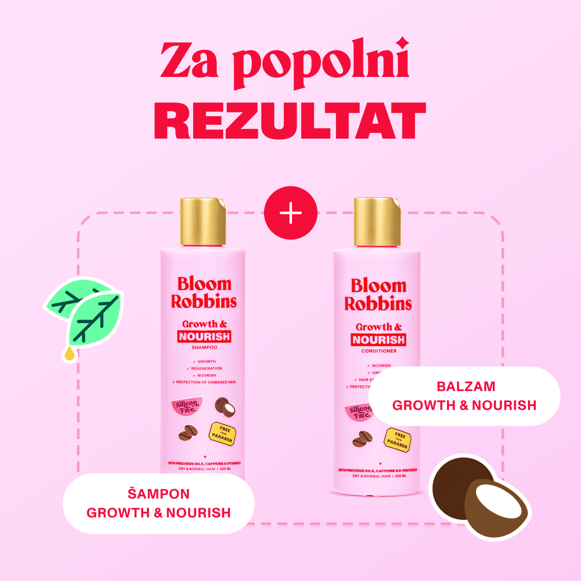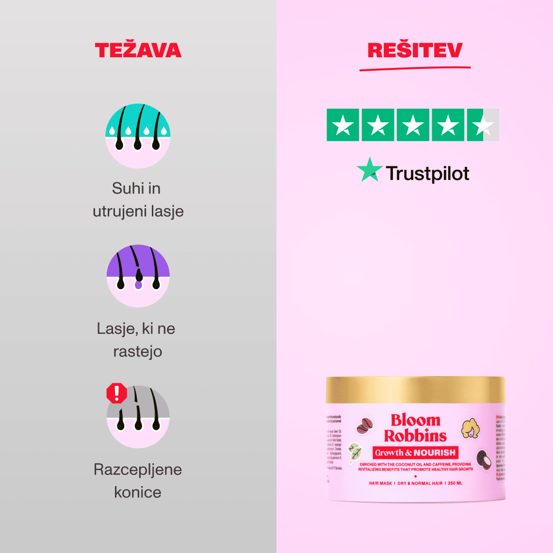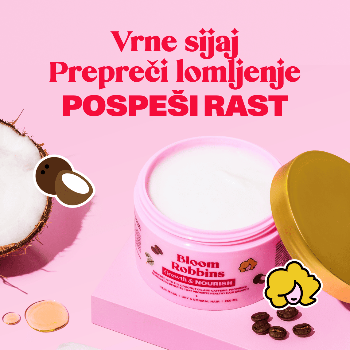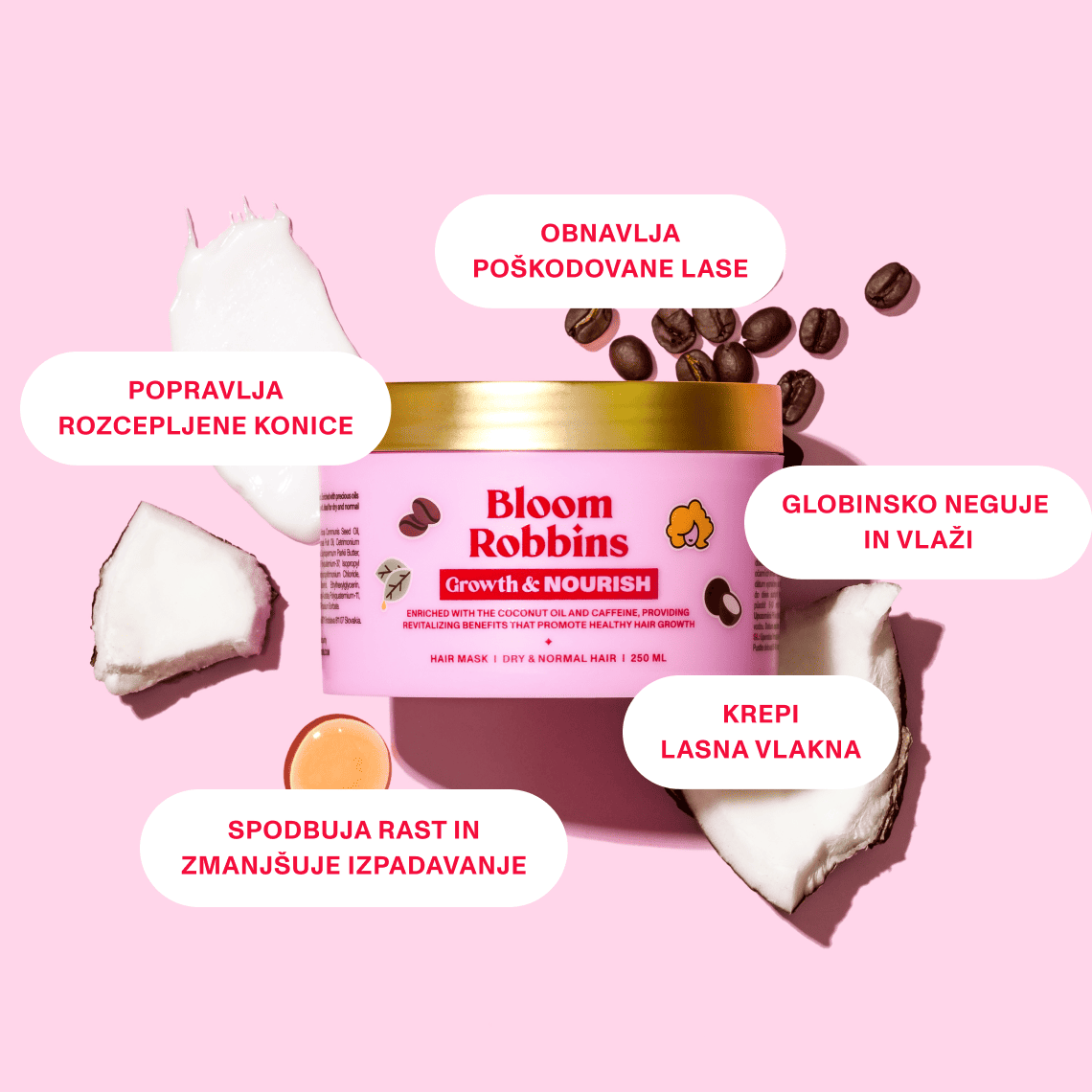 Če si eden izmed mnogih, ki imajo težave z izpadanjem in lomljenjem las, je maska za rast las s kofeinom - Growth & Nourish prava izbira zate. Maska za rast las z odlično kombinirano sestavo bo poskrbela za hitrejšo rast las, jih obnovila in navlažila. V teksturo in čudovit vonj po kokosu se boš enostavno zaljubila že ob prvem nanosu!