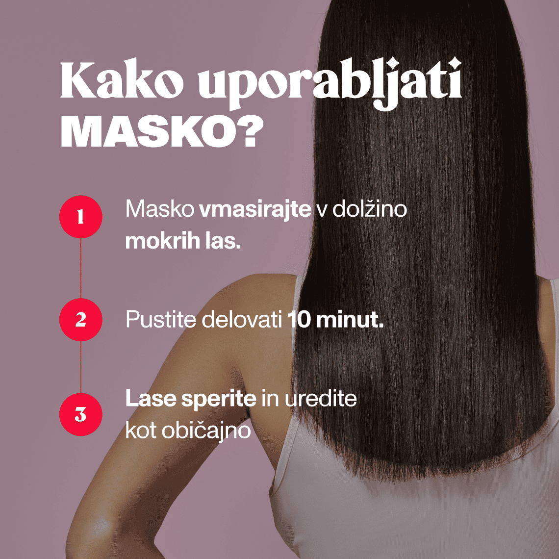 Pri maski za lase je pomembna pravilna uporaba. Le tako lahko dosežeš zaželeni učinek. Pri nanašanju maske naj bodo lasje mokri, saj tako bolje absorbirajo učinkovine, ki jih maska za lase zagotavlja. Masko za lase vmasiraj po dolžini las in pusti delovati 5-10 minut. Ko čas poteče, lase temeljito speri in posuši kot običajno.