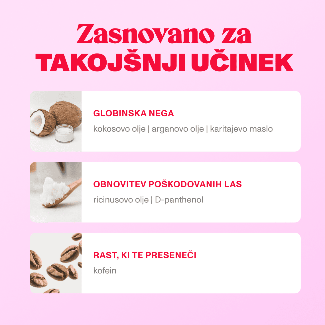 Kokosovo olje, karitejevo maslo, ricinusovo olje, arganovo olje, D-pantenol, kofein