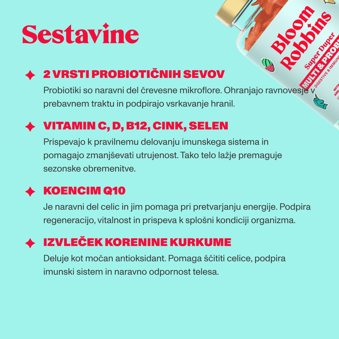 Glukozni sirup, sladkor, voda, askorbinska kislina, želirno sredstvo (pektin), kislina (citronska kislina), ergokalciferol, regulator kislosti (trisodno citrat), cinkov citrat, tindalizirana mešanica probiotikov (L. rhamnosus in B. lactis), naravna aroma, koencim Q10, izvleček kurkume (Curcuma longa), rastlinsko olje (kokosovo olje), barvilo (paprikin ekstrakt E-160), vitamin B12 (cianokobalamin), sredstvo proti sprijemanju (karnauba vosek), natrijev selenit.