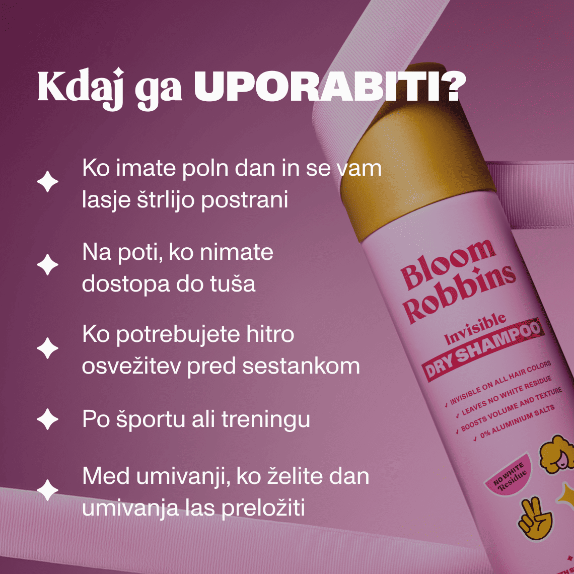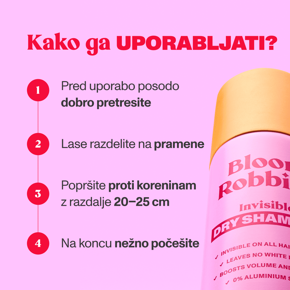 Lase razdelite na enakomerne dele. Pred uporabo pretresite pločevinko. Držite jo približno 20–25 cm od glave in popršite po koreninah, kjer so lasje najbolj mastni. Nato jih temeljito razčešite.